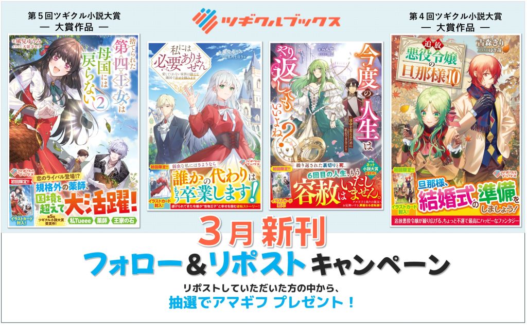 新タイトルが2作品「私には必要ありません 愛してくれない家族は捨てて隣国で幸せを掴みます」「今度の人生はやり返してもいいよね? ~運命を変えるために私ができること~」、そして第5回ツギクル小説大賞 大賞受賞作「捨てられた第四王女は母国には戻らない2」の続刊、第4回ツギクル小説大賞 大賞受賞作「追放悪役令嬢の旦那様10」も登場しますのでお楽しみに!